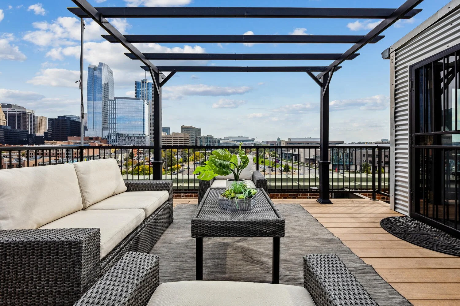 The exclusive rooftop patio is a standout feature, feeling like an extension of the interior living space. With 360-degree views of downtown and the surrounding mountains, the expansive outdoor area is perfect for lounging, dining, or even cultivating a rooftop garden, offering year-round enjoyment of urban living.